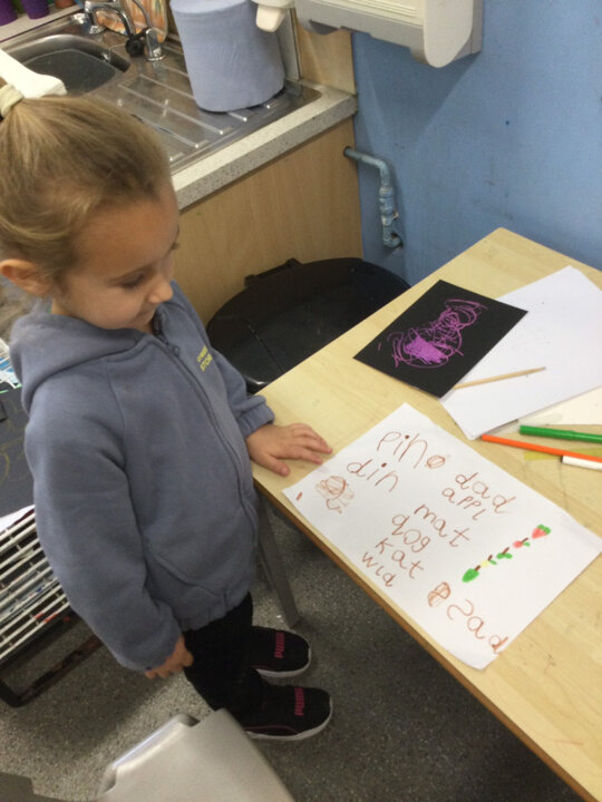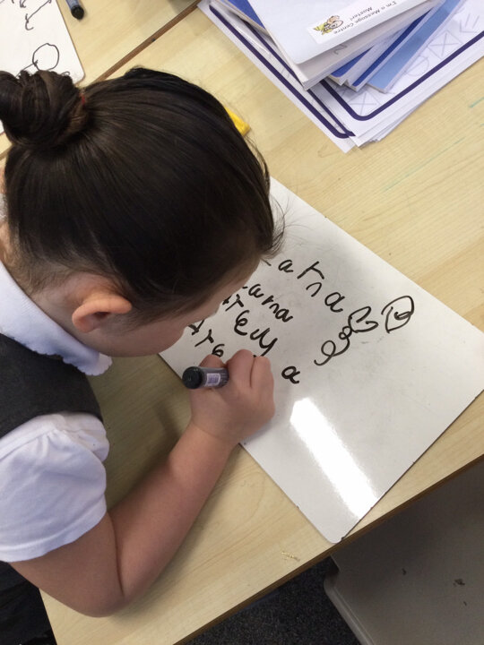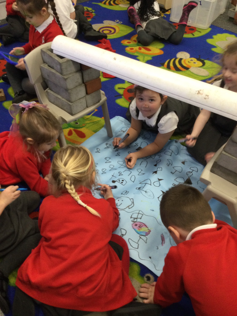 Children begin their journey towards writing, not by producing letters and words, but by simply making marks. The marks children begin to make slowly start to have more meaning for them and at first may seem like random swirls but as their fine motor skills develop we see the emergence of circles, lines and dots. To develop our whole body muscles (gross motor) and to control our upper body and shoulders for controlling the marks we make we take part in daily ‘Write dance’ activities. In these sessions we create marks to music using our whole body to perform movements before representing these marks on paper through pictures. Also to support with our fine motor development we regularly exercise our fingers and build up control with our hands by taking part in daily ‘Dough Disco’ activities. As we learn our new sounds we become familiar with letters that we are keen to be able to produce in our mark making as we begin to give our writing meaning.